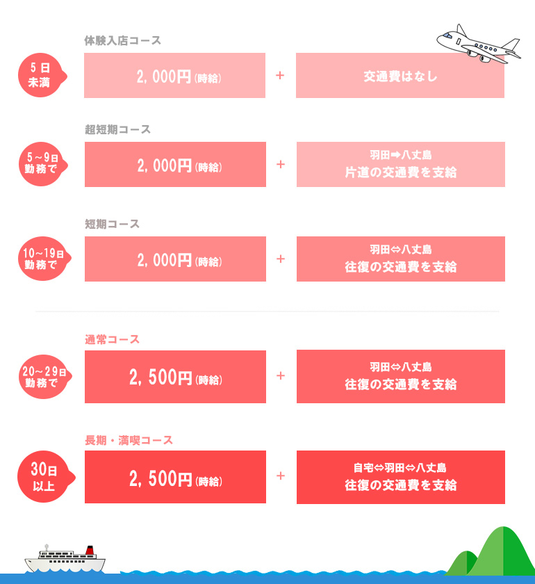長期で働くほど、八丈島も楽しめ、時給も高くなります。